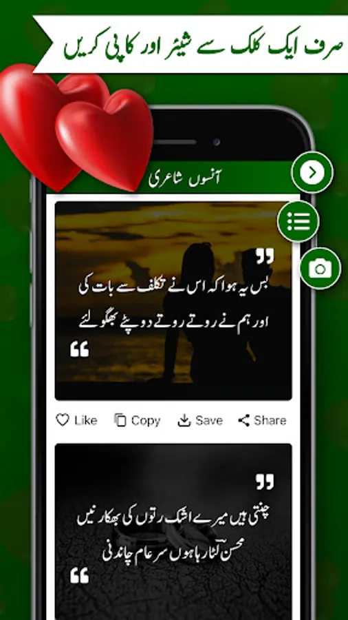 Sad Urdu Poetry Urdu Shayari app provides you with different types of friendship poetry in Urdu for social media apps. This is the best Shayari ki app for love poetry in Urdu. This Shayari ki app had a great collection of romantic Poetry in Urdu and Urdu ghazals. Just one click and you can add Urdu Shayari love poetry to your favorite list. This Urdu Shayari status app contains the option of changing the pictures in the background.