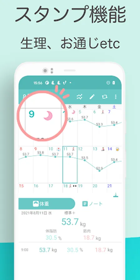 Events that affect weight changes, such as meals, exercise, and menstrual cycles, can be recorded with stamps.