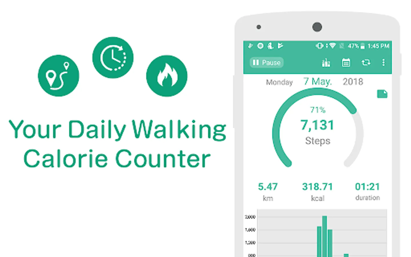 "Pedometer - Free Step Counter Maipo" is a very convenient pedometer app that automatically records and calculates your steps, time walked, and calories burnt.