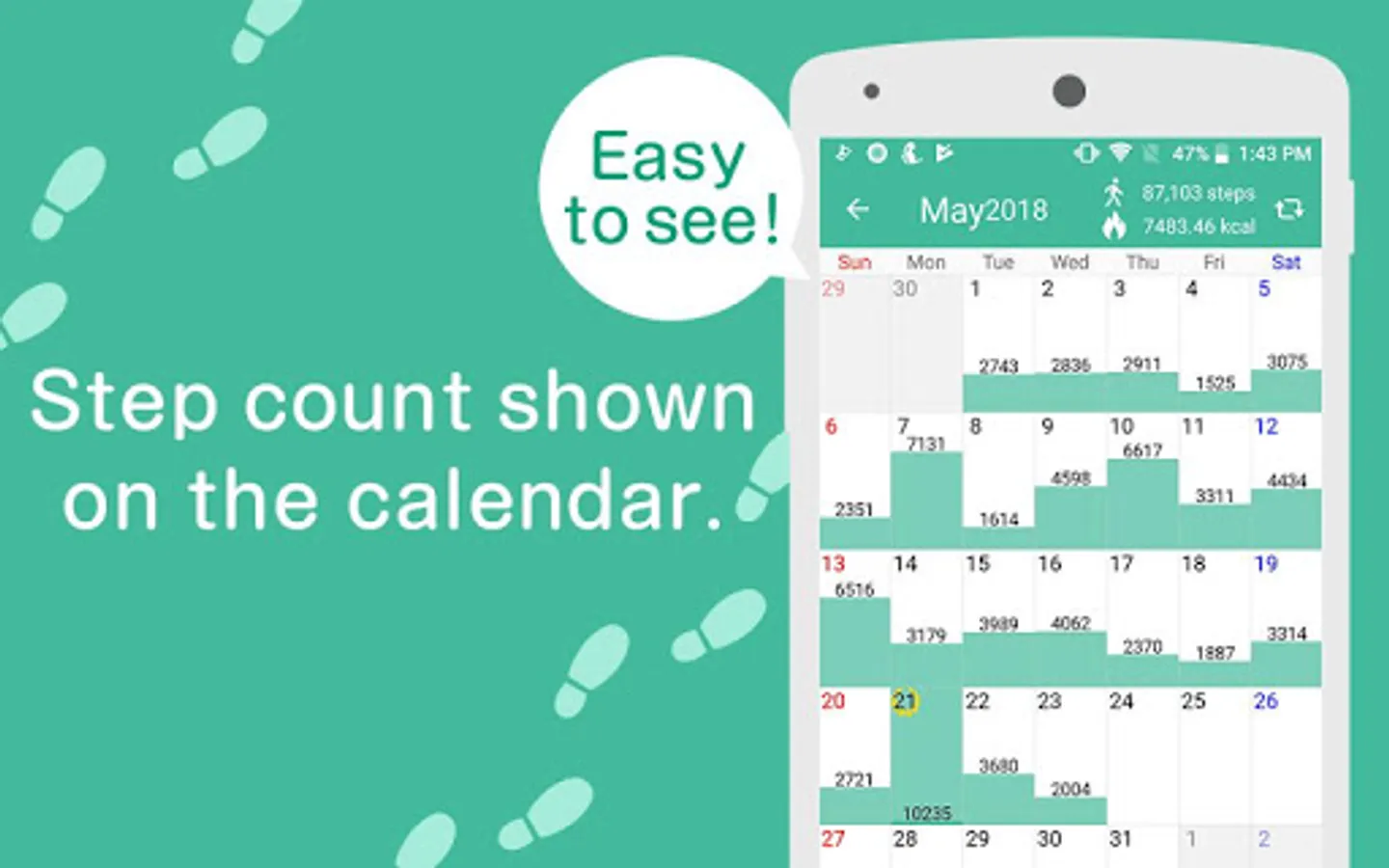 The app also features a monthly calendar screen with a day-by-day visual chart of steps walked, allowing you to combine exercising with your own lifestyle rhythm.