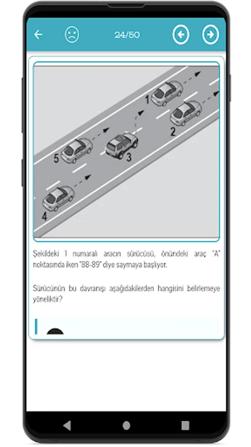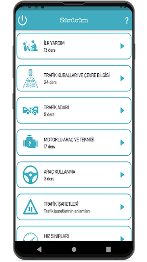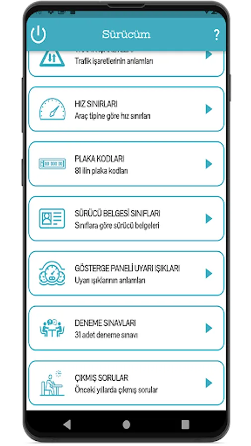 In the application, first aid, traffic rules and environmental information, traffic etiquette, motor vehicle and technique, traffic signs, speed limits, provincial plate codes, driver's license classes, in-car instrument panel and warning lights, preparation notes for the steering exam, trial exams and previous There are questions that come up in the period.
