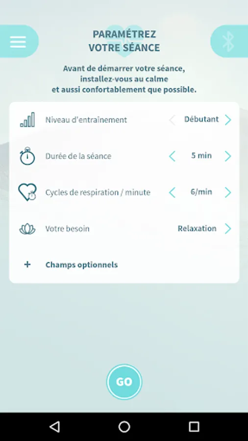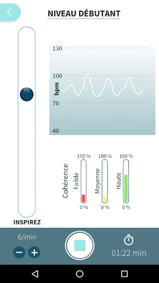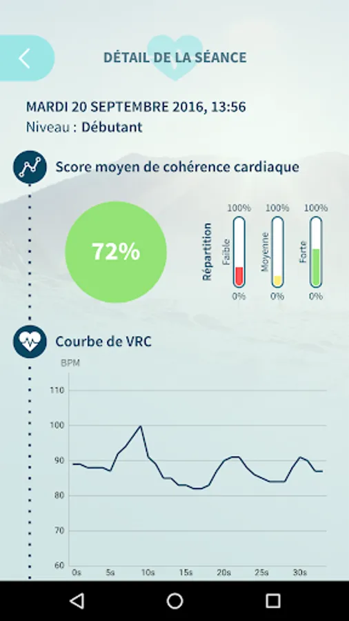 - 3 color indicators (green, yellow, red) which evolve throughout the exercise and tell you when you succeed or not in getting into cardiac coherence