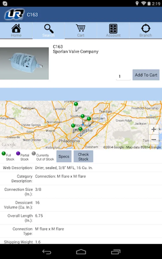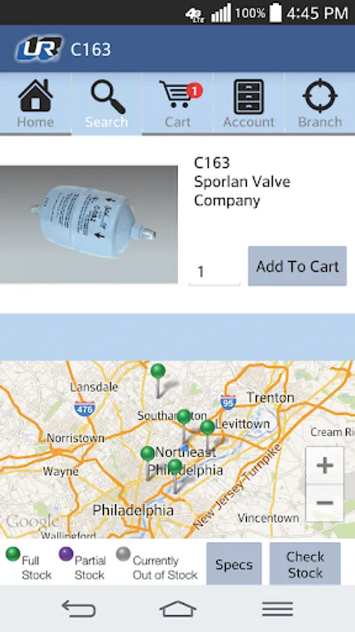 * Check Stock: With the UR Mobile app you can easily check Price and Availability locally, based on your current location or anywhere within the USA based on a zip code search. The app will display a map with nearby branches and indicate on a map the closest stores with current inventory status.