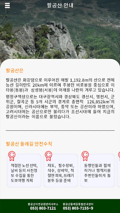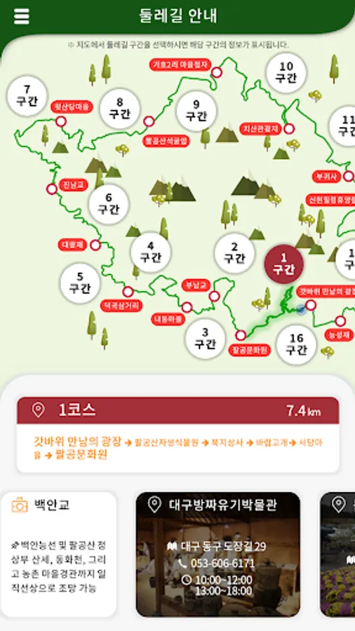 * Use the app to learn information about Palgongsan Dulle-gil and information for safe hiking.