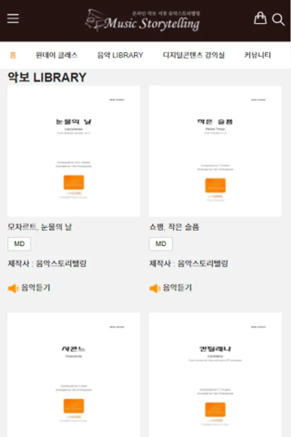 음악스토리텔링은 온라인 악보 서점으로 어린이 음악콘텐츠, 악보library, 피아노교재전집 등 다양한 교재를 만나보실 수 있습니다.