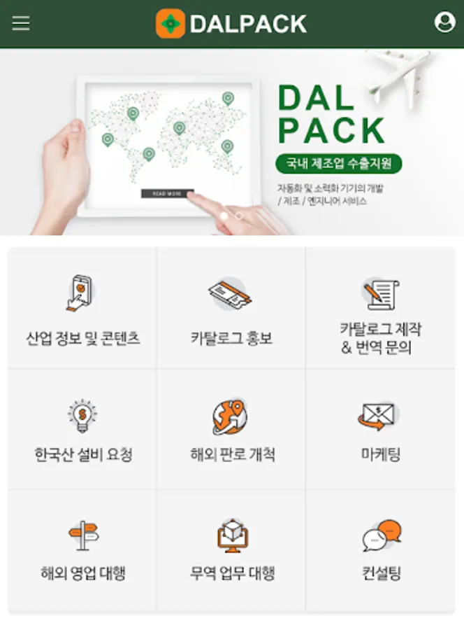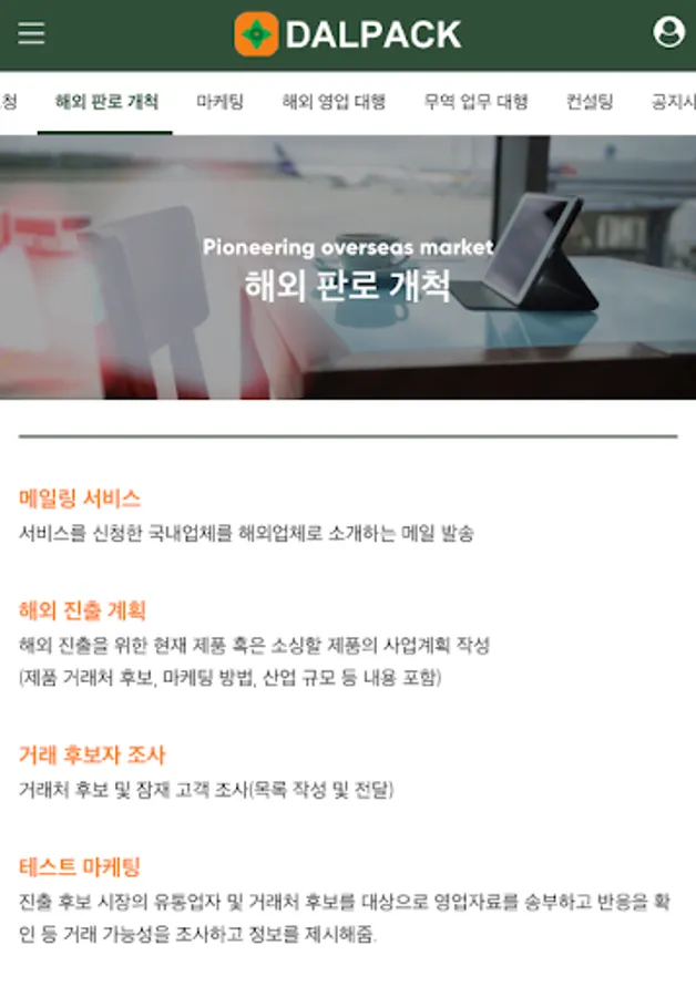 - 해외 영업 대행 : 해외 영업 인원을 따로 두기 힘든 기업을 위해 수출을 위한 해외 거래 체계를 구축해 주고 영업 및 홍보를 대행하거나 해외 영업 상담까지 동행하는 서비스입니다.