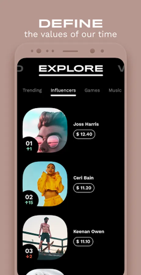 • With your attention and support you can define the values of our time. Explore the platform and find out what is popular and who is trending.