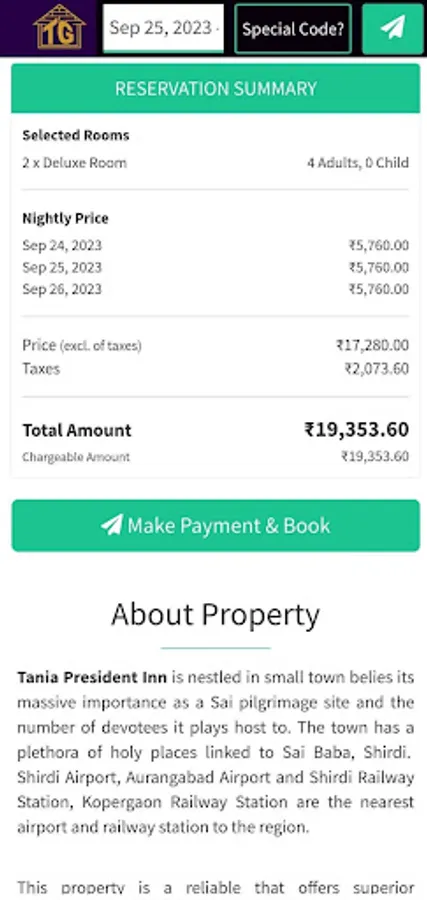 Tania President Inn Hotel booking (Powered by Jupiter). Tania President Inn is nestled in small town belies its massive importance as a Sai pilgrimage site and the number of devotees it plays host to. The town has a plethora of holy places linked to Sai Baba, Shirdi. Shirdi Airport, Aurangabad Airport and Shirdi Railway Station, Kopergaon Railway Station are the nearest airport and railway stations to the region.