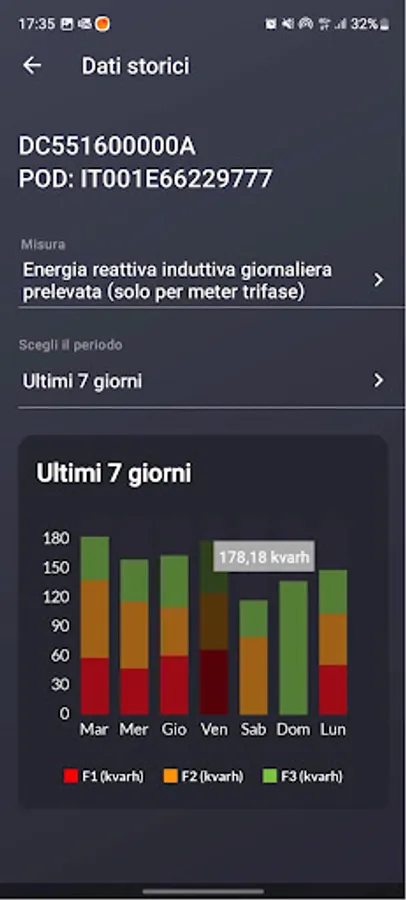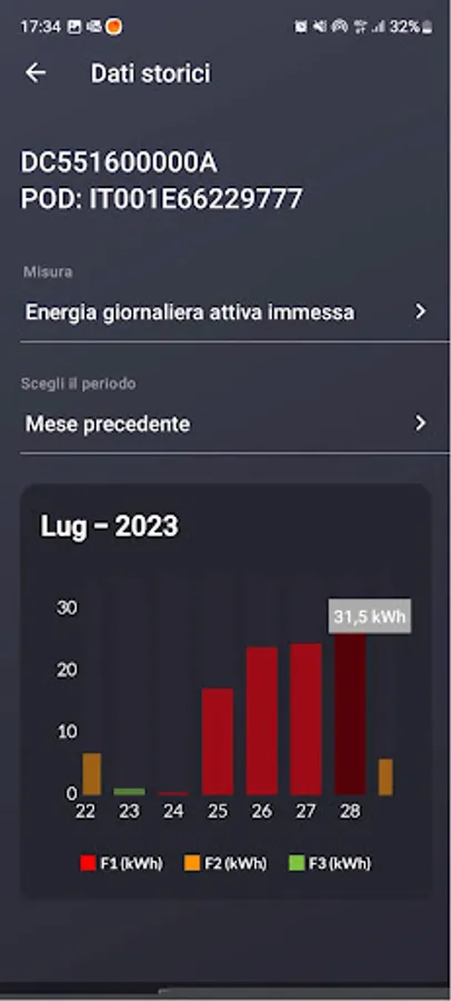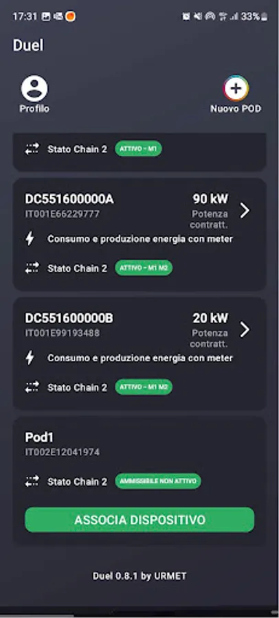 The app allows you to check the admissibility of your electricity utility (POD) to the CHAIN2 service, configure the device and view all the data made available by the electricity meter on your smartphone. Among the main measurements it is possible to detect: