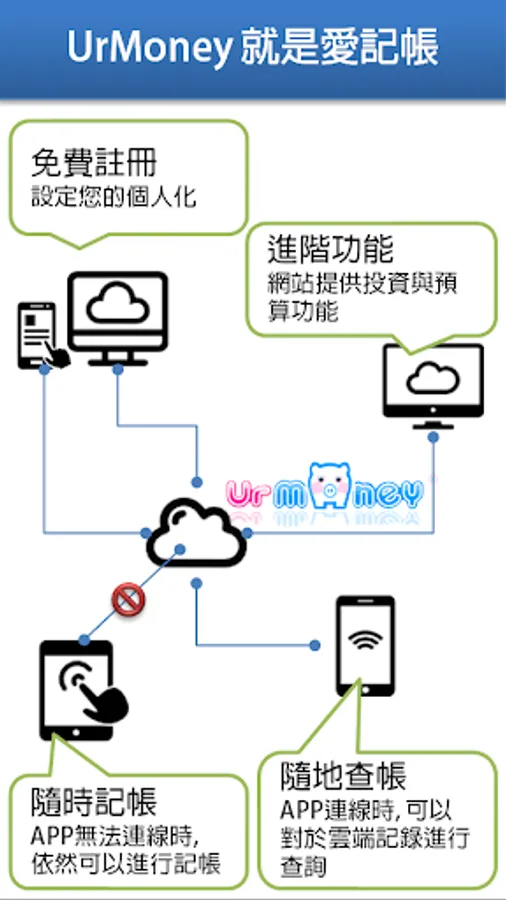 記帳家APP提供了與雲端空間(https://www.urmoney.com.tw), 無間斷的行動記帳模式, 您可以在電腦上網記帳, 也可以在離線時使用APP記帳, 並透過上線的時間, 將帳目上傳到雲端空間裡, 享受隨手記帳和查詢帳目的便利性.