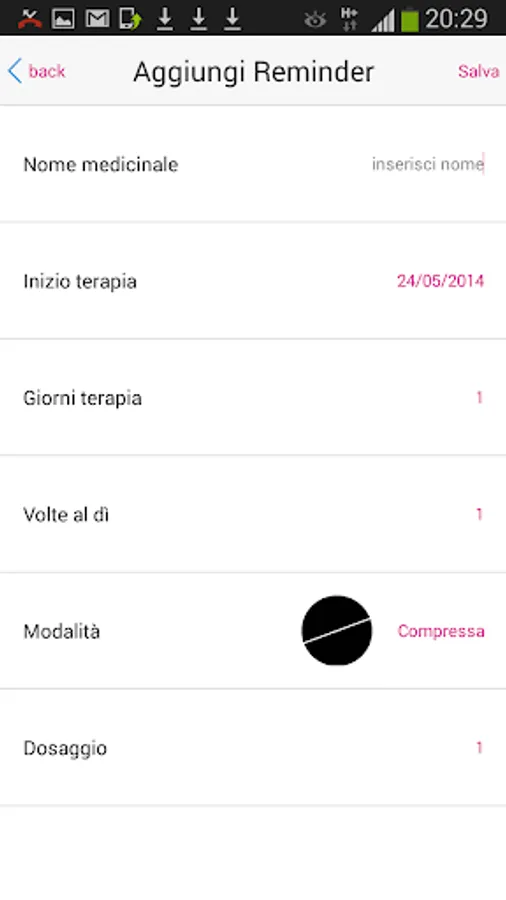 With the Reminder (the bell in the home), you can register to be updated on new developments and the App to take advantage of a scheme to schedule the treatment / and, therefore, ability to insert: name of the medicinal form (tablets, capsules, bags, drops, syrup, injection, detergent, cream), start date, number of days of therapy, the dosage (how many times a day) and dosage of the drug. Therapy, with their respective schedules, it will be highlighted with a special sound in the days and the scheduled time for the taking.