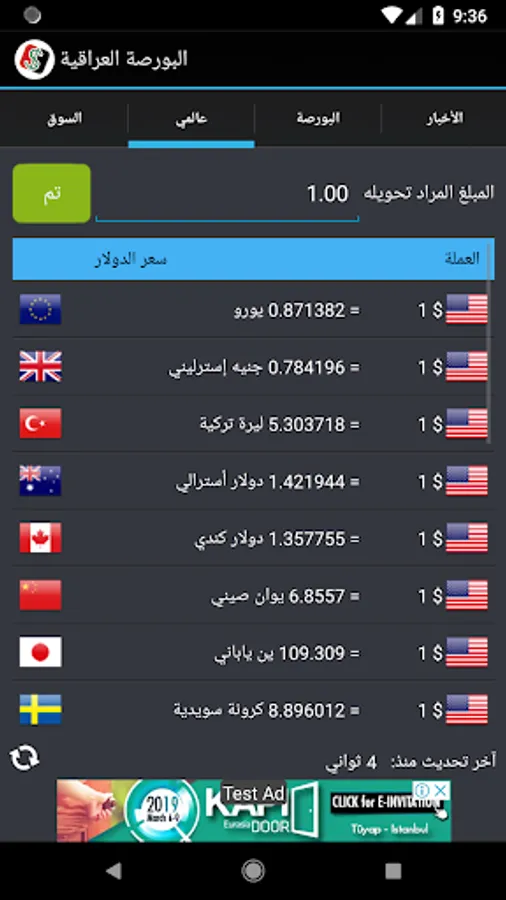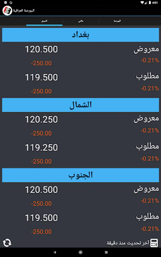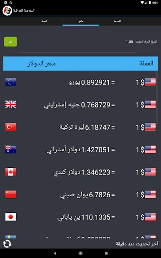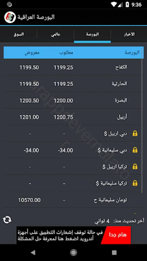 نرخەکان دیاری کراوە ڕاستەوخۆ لە بازاڕ و شوێنی گۆڕینی نرخی دراوەکان پێویست بەوە ناکات بڕۆیت و پرسیار لە نرخی دۆلار بکەیت چونکە نرخەکان لەناو مۆبایلەکەت بەردەست دەبێت لە ماوەی دوو خوولەکدا ناوەندی نرخی دۆلار لە باکوور و باشووری بەغدا نرخەکانی بۆڕسەکانی عێڕاق وەک بۆرسەکانی کیفاح حارثیە بەسڕە هەولێر سلێمانی دهۆک ههتد ..