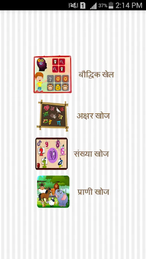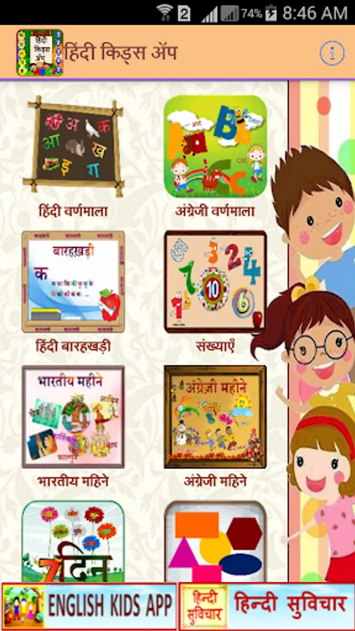 This app shows various sections like Hindi Varnamala, English Alphabets, Hindi Months, English Months, Weekdays in Hindi, Hindi Barakhadi, Hindi Numbers, Shapes and Color in Hindi, Birds, Animals, Fruits, Vegetables, Flowers, Basic Computer Information, Occupation in Hindi, School Stationery Name, Vehicle Directions, Good Habits for kids in Hindi, painting in Hindi, My Family Member information in Hindi and Kids painting Book , Baby Laptop for Kids, Kids Spelling Learning Kids Mathis and Games for kids.