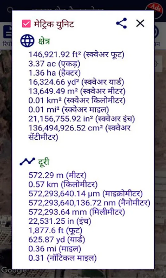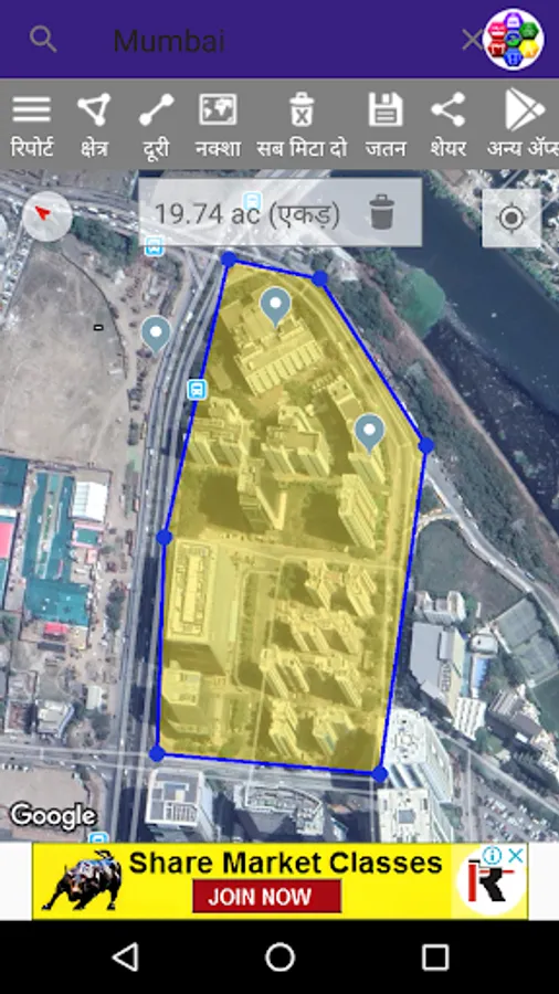 Use the Hindi Google Maps Area Calculator Tool to draw an area on a map and find out the measurement of the enclosed area. You are also able to save your areas for use later on. Click on the map to start drawing.