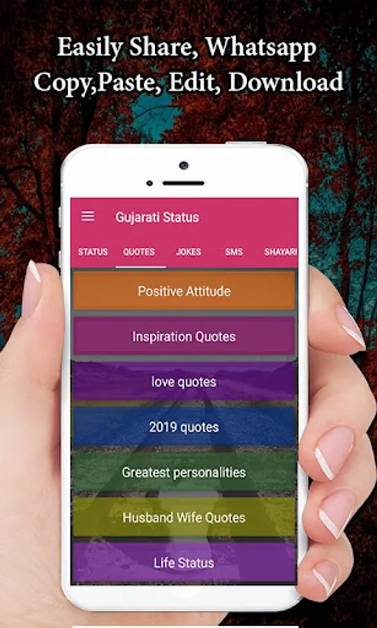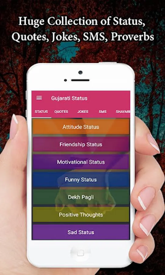 In the Category of Gujarati Status have the following type of status included Like Gujarati Attitude Status, Friendship Status, motivational status, funny status, Dekh Pagli Status, positive thoughts Status, sad status, Alone Status, selfish Status. The Category of Gujarati Quotes have the following type of Quotes positive attitude quotes, inspirational quotes, love quotes,2019 Quotes, greatest personality quotes, husband-wife quotes, relationship quotes, Also Huge collection of jokes and Sayari
