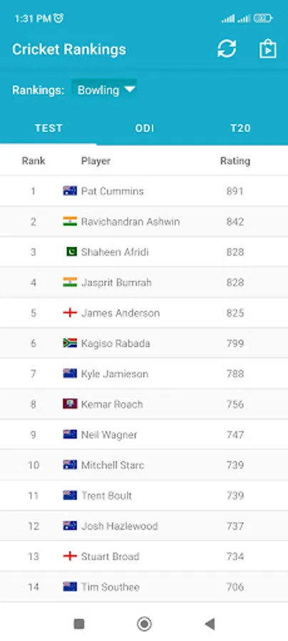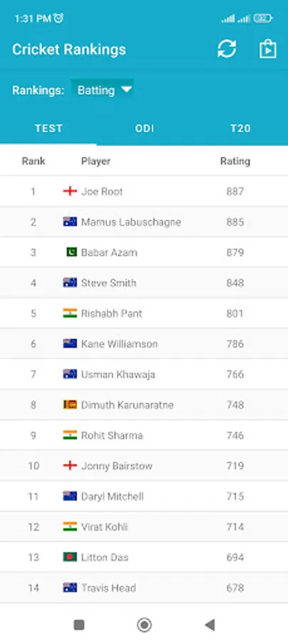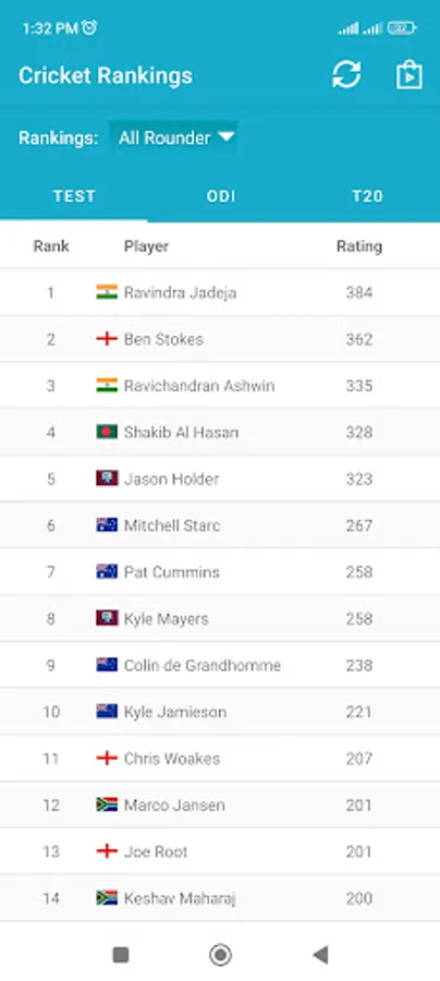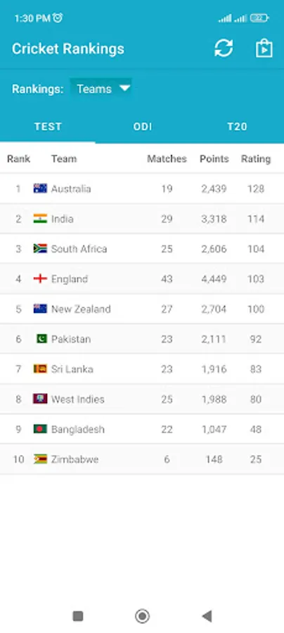 Cricket lovers can check the updated ICC Cricket rankings for Test, ODI and T20 matches. You can also find players rankings for batting, bowling and all-rounders. This application automatically updates the stats for ICC rankings, ratings and points.