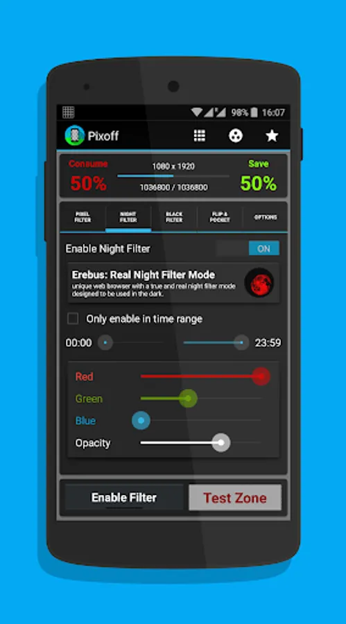 Saves battery with filter that turns off pixels