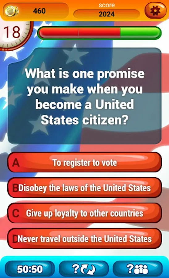 Do you think you are ready to go to the USA? Check on how much you really know about the USA and prepare for your citizenship interview via this fun and educational citizenship trivia quiz! With this US citizenship test app you can prepare for the Civics Test administered during your interview. During the interview, applicants will be asked up to 10 questions from the list of 100 questions in English and they are obliged to answer correctly to at least 6 questions. Via this unique trivia game, you can learn lots of new "fun facts" about different aspects of American way of life and culture as well as American history or geography and prepare for the citizenship interview. If you are a fan of super fun educational games for adults for learning and free quizzes, download US Citizenship Test Quiz for free and prepare for one of the most important tests of your life! You may take this app as an "US encyclopedia" – learn a multitude of interesting facts about Americans! Explore the intriguing Civics test questions with this awesome trivia quiz game! Don't waste a great opportunity to gain some new knowledge about US history, geography, law and other areas of vital importance for you! Get a ton of US citizenship quiz questions and answers and have a blast with this fun quiz game for those who want to become US citizens and for all quiz lovers! The best US civics test to help you be completely prepared for the American citizenship test 2020.