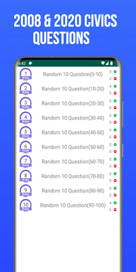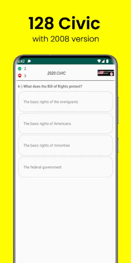 You can access 2020 (128 questions) and 2008 (100 questions) versions of the Civics Tests in our app.