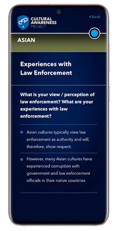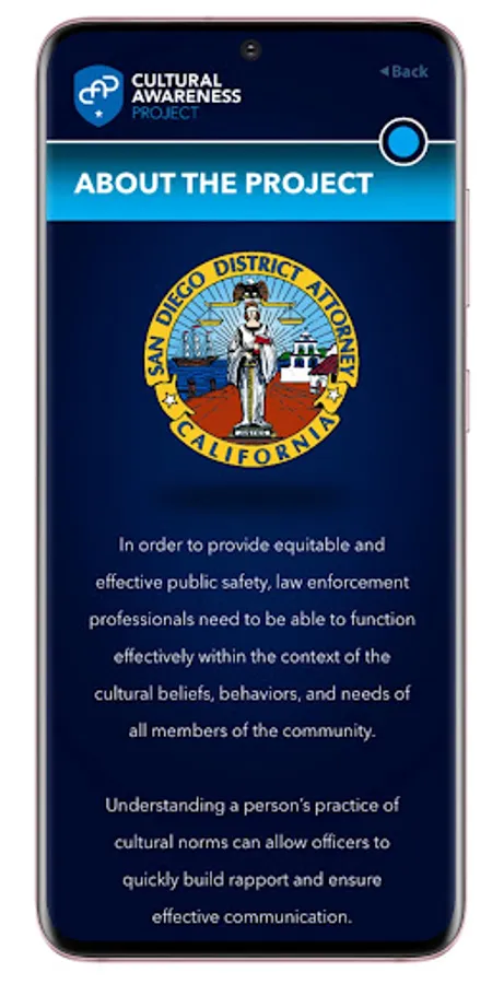 The San Diego County District Attorney’s Interfaith Advisory Board is committed to supporting and fostering culturally competent law enforcement officers. In order to provide equitable and effective public safety, law enforcement professionals need to be able to function effectively within the context of the cultural beliefs, behaviors, and needs of all members of the community. Understanding a person’s practice of cultural norms can allow officers to quickly build rapport and ensure effective communication. The board conducted focus groups with various cultural groups to gather content for this app that law enforcement officers can use to respectfully respond to non-emergency situations. "