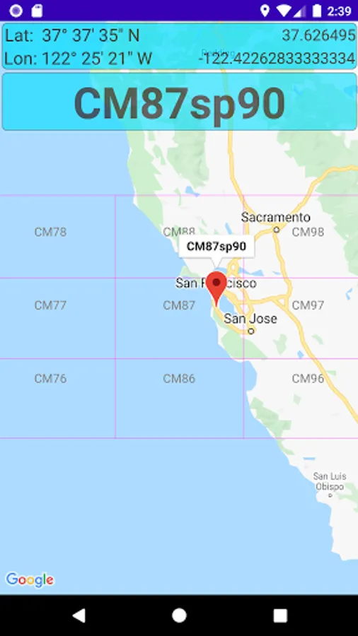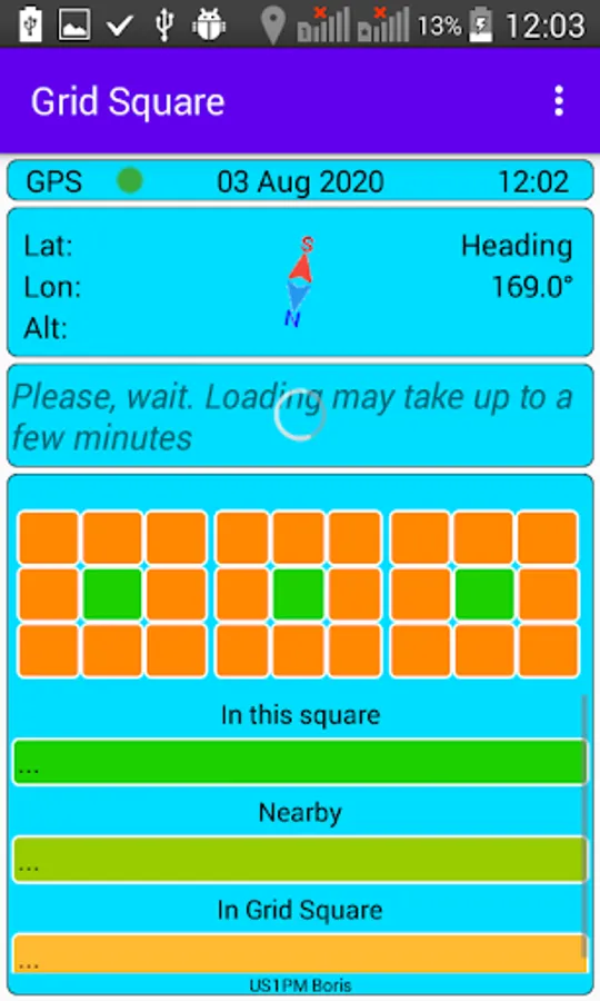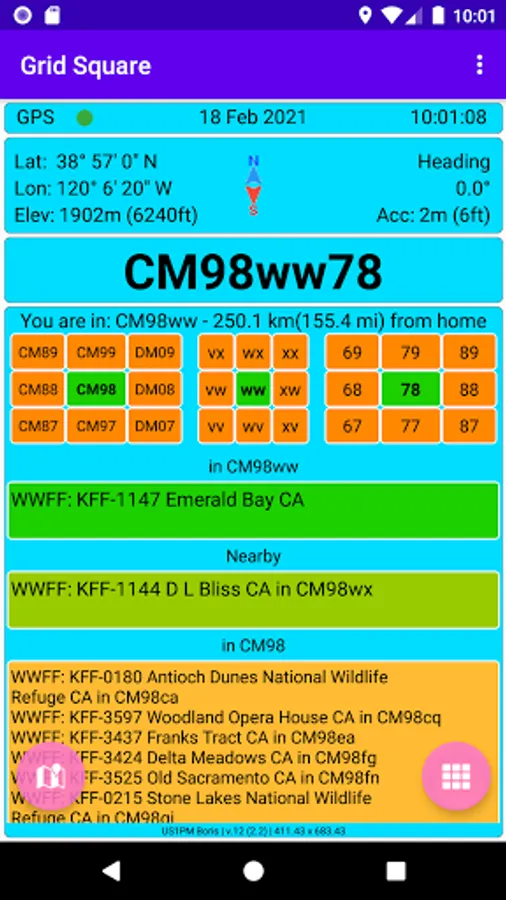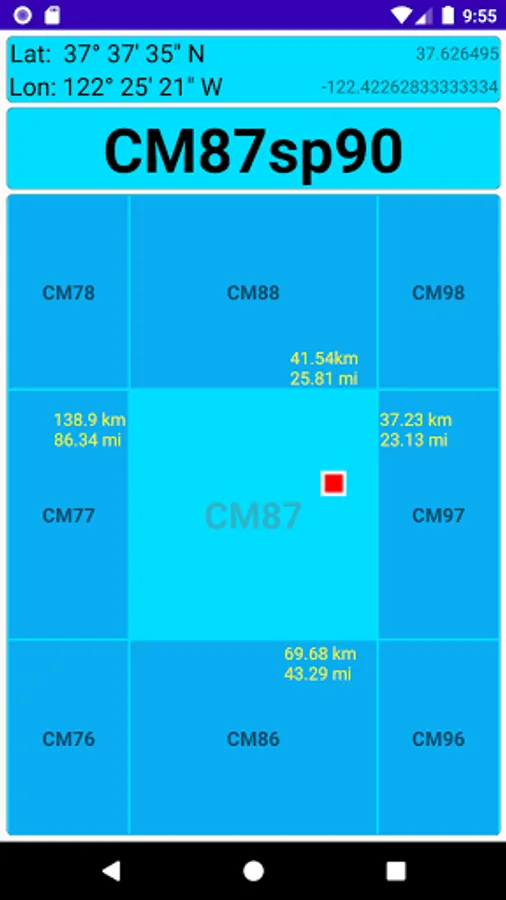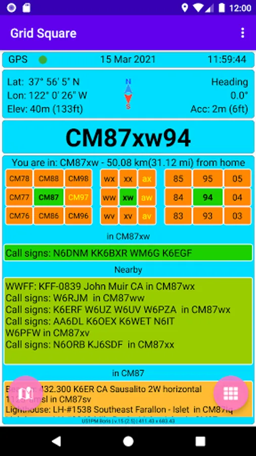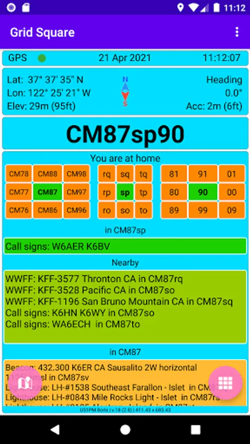 Grid Square app displays an 8-symbol Grid Square Locator (a.k.a. Maidenhead Locator, QTH Locator) value calculated based on the geographical coordinates obtained from GPS satellites and mobile network.