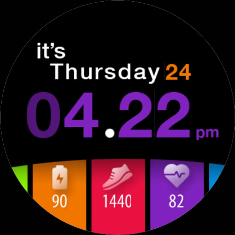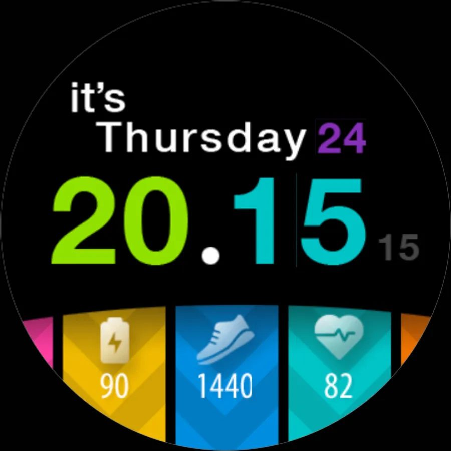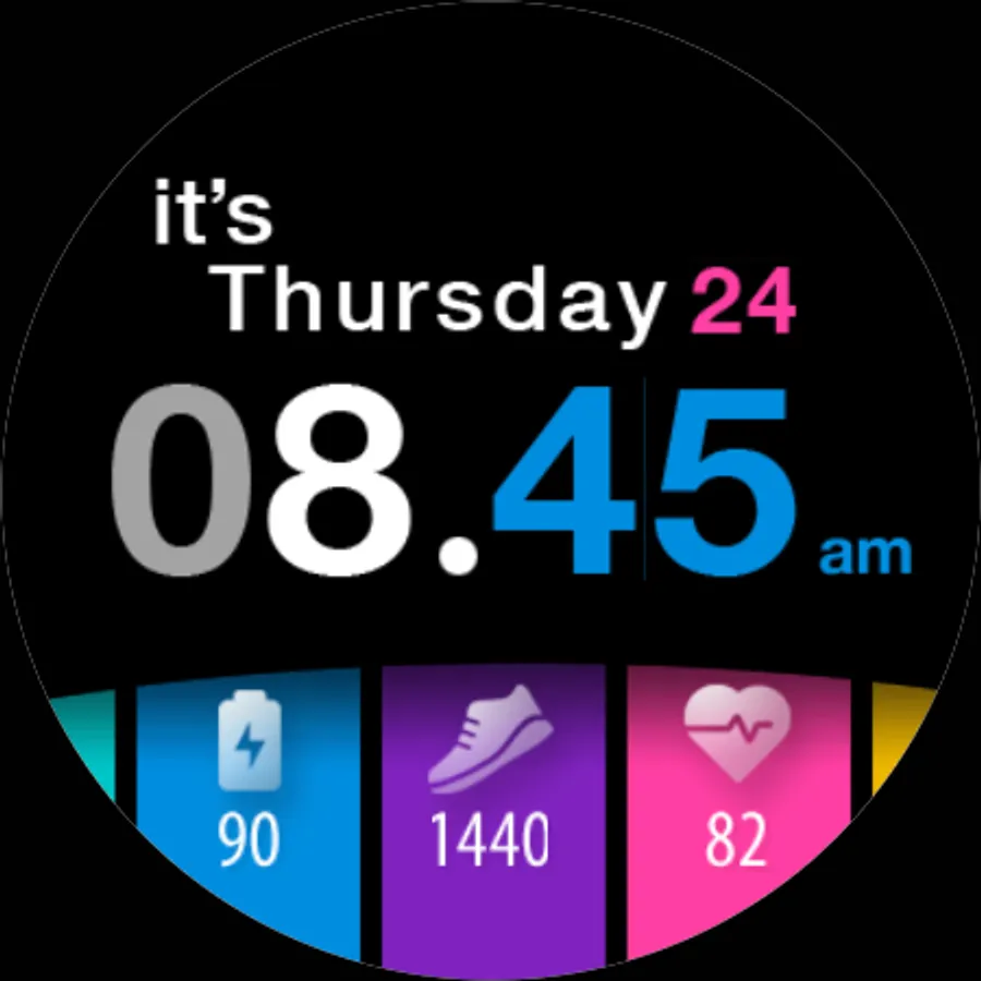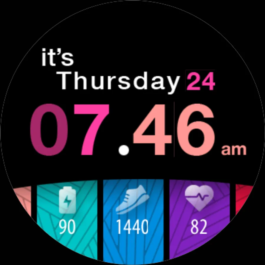 A colorful tiles watch face with day in words for Wear OS watches. Pick the color combination and mix it. You can also add a decoration.