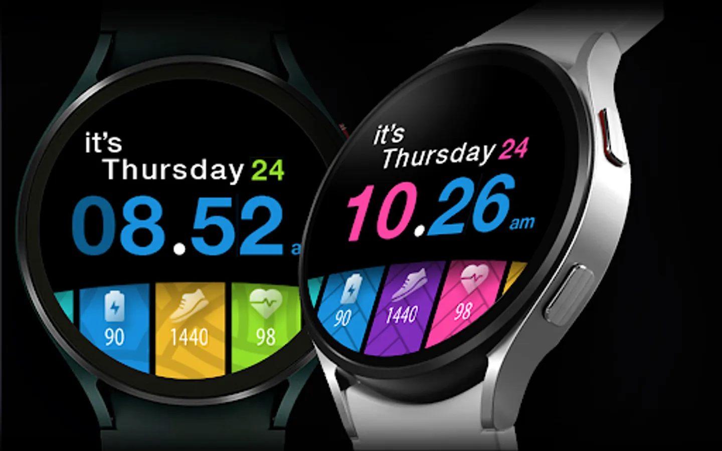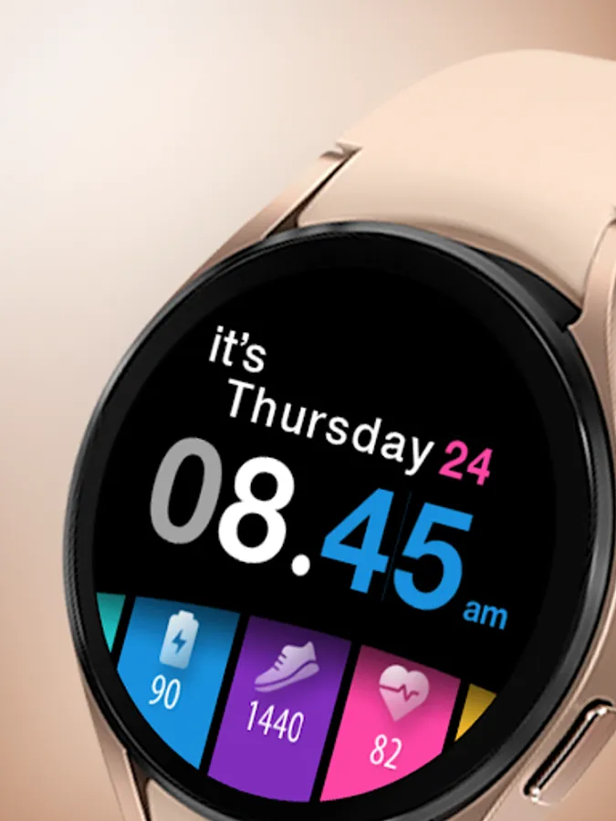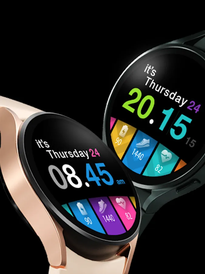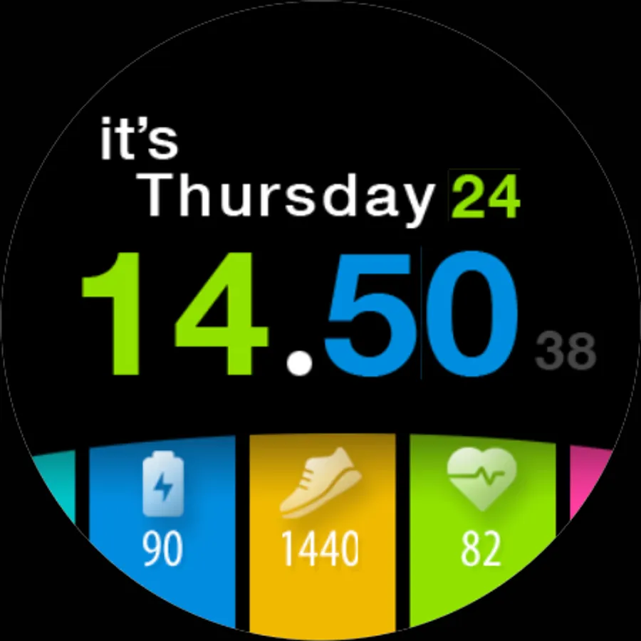 A colorful tiles watch face with day in words for Wear OS watches. Pick the color combination and mix it. You can also add a decoration.