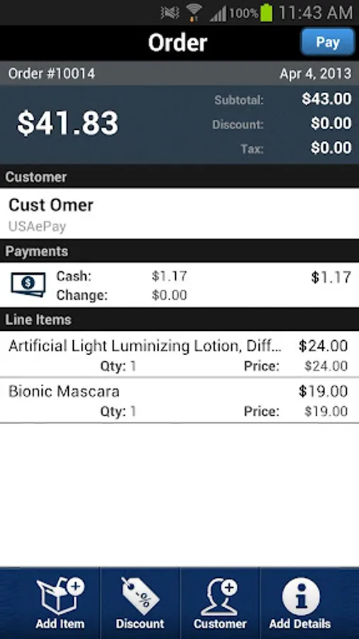 All transactions, data, and orders are stored on USAePay’s Level-1 PCI Compliant payment gateway. If your device is lost, stolen or damaged, just log in to the application on another device and recover your transactions, orders, and batches through an automatic sync with our console.