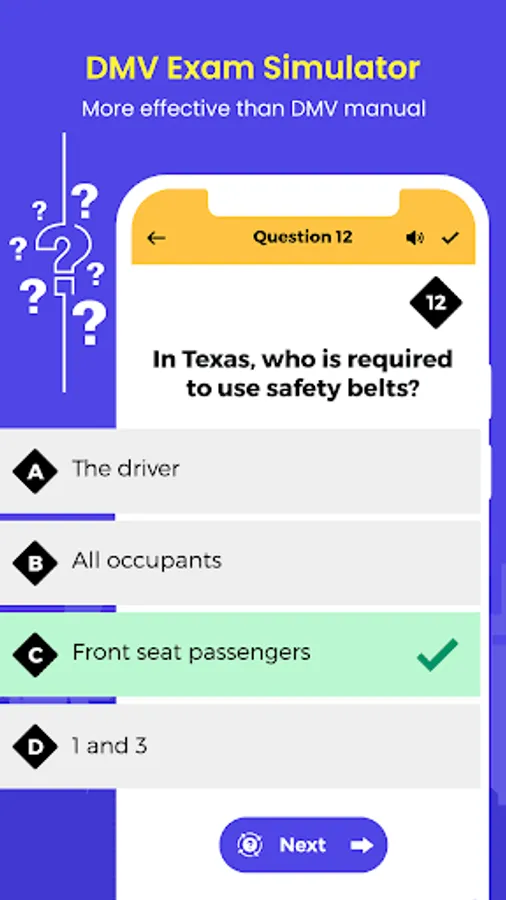 In DMV Driving Preparation USA, you have to choose the state and category. DMV exam simulator gives questions with multiple options. Select the right option and click next for the new question. Click on the speaker button to get the question audio preview. Completing all questions, you will get the result in percentage with the number of correct answers and wrong answers.