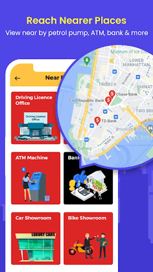 ✨ You can search nearby your driving license office, petrol pump, ATM machine, Bank, Car, and Bike showroom