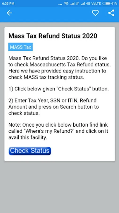 USA Tax Refund Status mobile app helps the people from different states of USA to check the refund status steps. One can use the category menu to choose your respective state such as Virginia, Oregon, Maryland, Mass Tax Refund, IRS Tax Refund Status, New Mexico, District of Columbia, Missouri, South Carolina, Alabama, Arizona, Arkansas, California, Colorado, Federal, Illinois, New Jersey, Pennsylvania, Michigan, North Carolina, Idaho, Georgia, Hawaii, Delaware, Connecticut Income Tax refund status guidance.