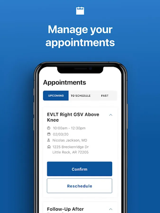 The app allows you to track and manage your entire treatment process -- from your initial visit to your recovery. Directly from your mobile device, you can review your care plan, manage your existing appointments, schedule new appointments, have a tele-health appointment with one of our leading providers, and access and pay your bills. Additionally, the app grants you access to reliable research-backed information about your condition and sends you convenient reminders about upcoming appointments to keep you organized and healthy.