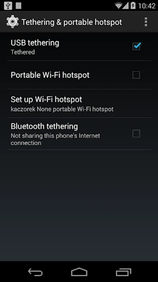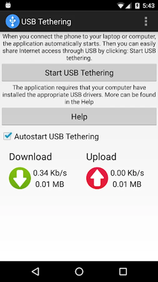 Usb Tethering is a simple application that shares Internet connection from your smartphone to your computer through usb connection. When you connect the phone to your laptop or computer, the application automatically starts. Then you can easily share Internet access through USB by clicking: Start USB tethering.