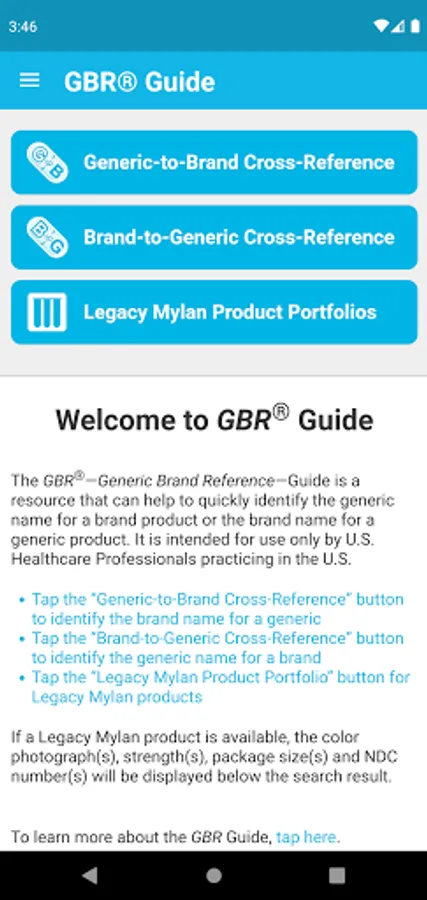 The--Generic Brand Reference--GBR® Guide is a resource, intended for use by U.S. healthcare professionals practicing in the U.S., that contains a comprehensive, cross-referenced listing of generic and brand pharmaceuticals. The GBR Guide can help to quickly identify the generic name for a brand product or the brand name for a generic product.