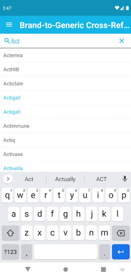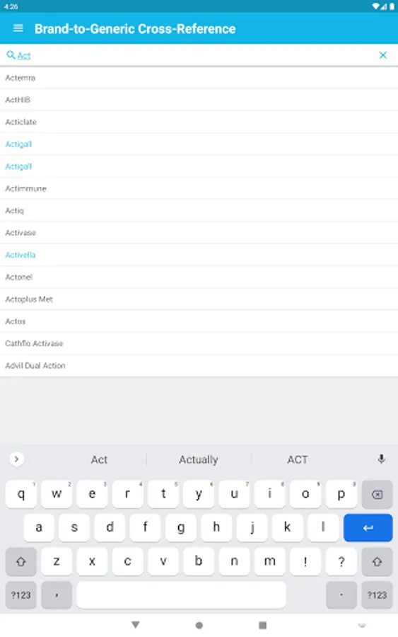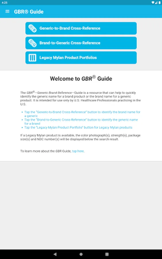 The GBR Guide app, which contains a scroll-able alphabetical index of drug products, includes the following features: