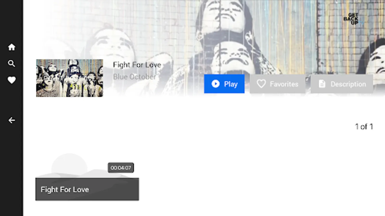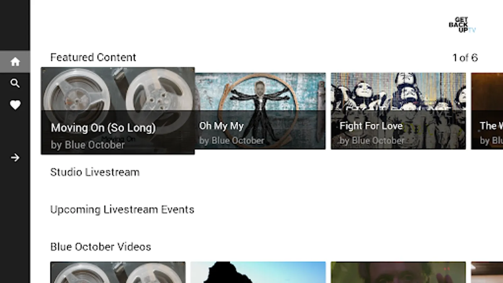 Get Back Up TV is an app and video platform to become inspired and realize you are good enough. Started as a platform for music videos and content for the band Blue October and Justin Furstenfeld, Get Back Up TV contains free content including music videos, live shows and more. The platform also contains livestream concerts.