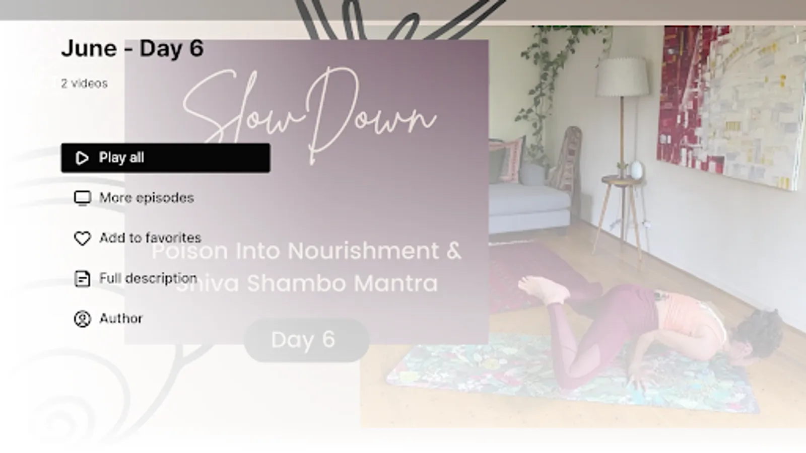 UNIQUELY THEMED CONTENT BASED ON YOUR MOOD: Curated playlists such as Morning Series, Evening Wind Down, Low Back Pain, Yoga for Sports and Mobility, Get Strong, Yoga for Stress and Anxiety, Yoga for Headaches, Yoga for Menopause, Yoga for Menstruation, and Yoga for After Travel.