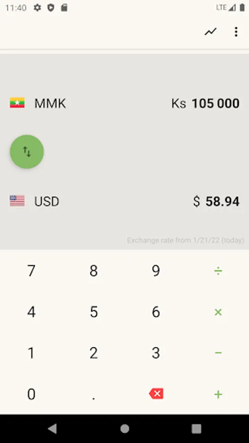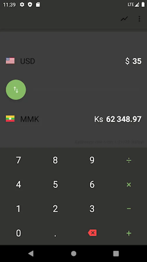 US Dollar to Myanmar Kyat is the best currency converter app which converts Myanmar Kyat to US Dollar in real time with latest exchange rates available for Kyat and US Dollar in international market and local markets as well. If you want to have a currency app on the go which lets you convert Kyat to US Dollar or US Dollar to Myanmar Kyat then you must download US Dollar to Myanmar Kyat Currency Converter app as it is very simple to use and very user friendly. There is no complex methods to use currency converter app, it has built in calculator as well which lets you plus, minus, multiple and divide your Kyat or US Dollar amount while converting them.