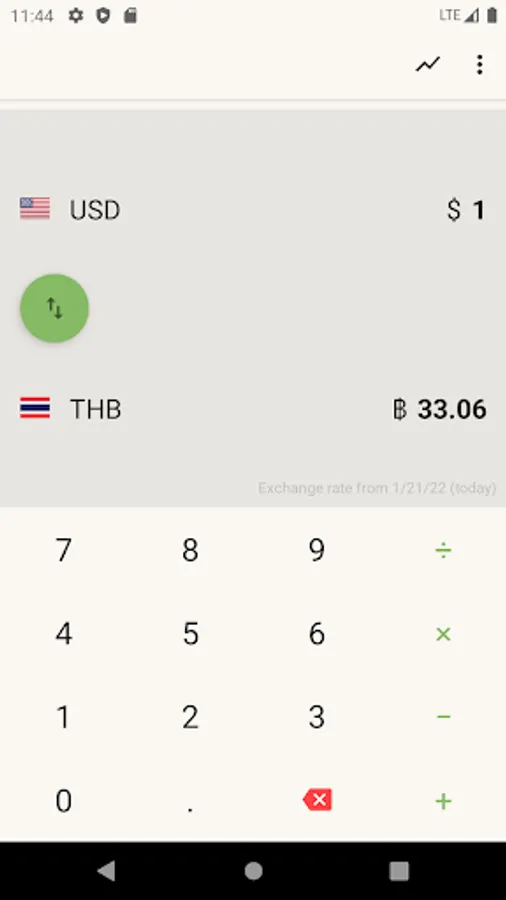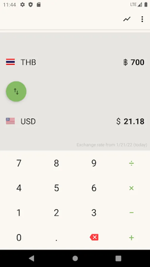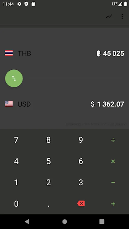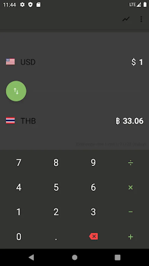 US Dollar to Thai Baht is the best currency converter app which converts Thai Baht to US Dollar in real time with latest exchange rates available for Baht and US Dollar in international market and local markets as well. If you want to have a currency app on the go which lets you convert Baht to US Dollar or US Dollar to Thailand Baht then you must download US Dollar to Thai Baht Currency Converter app as it is very simple to use and very user friendly. There is no complex methods to use currency converter app, it has built in calculator as well which lets you plus, minus, multiple and divide your Baht or US Dollar amount while converting them.