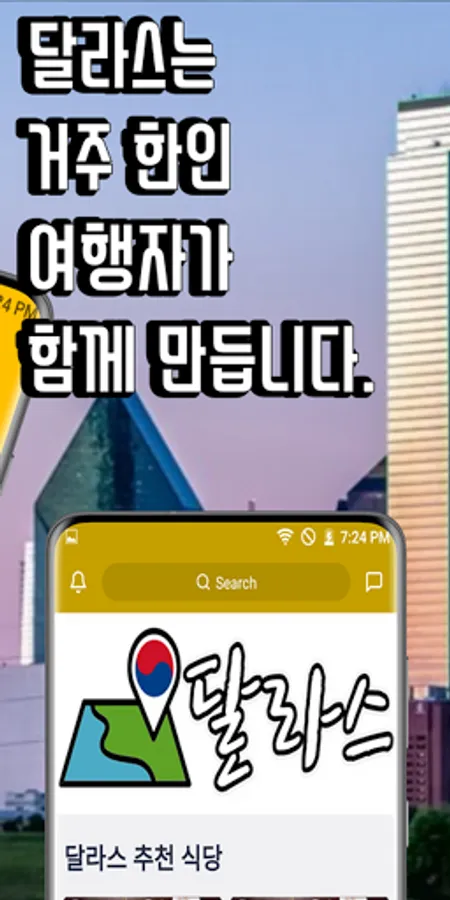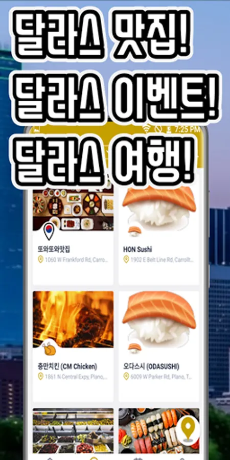 This app provides information and location of Korean restaurants, restaurants, and travel in Dallas, as well as event information necessary for a Dallas trip.