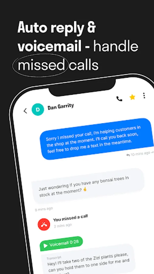 Create your own custom voicemails, per phone number, so you can always give the best level of customer service, even when you weren’t able to take the call, and with transcripts, you can read your voicemails on the go, straight from your message threads.