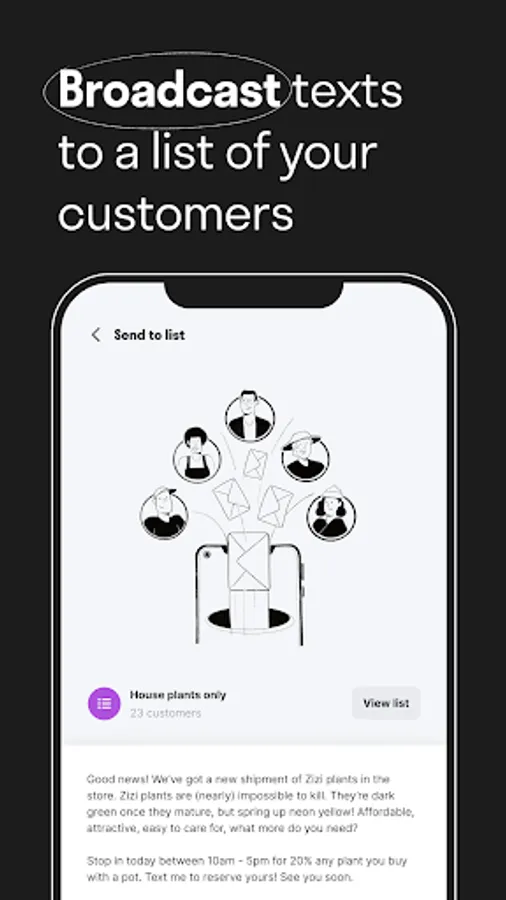 Create customer lists in an instant, share them with the team or keep them private, then send one message to as many customers as you need.