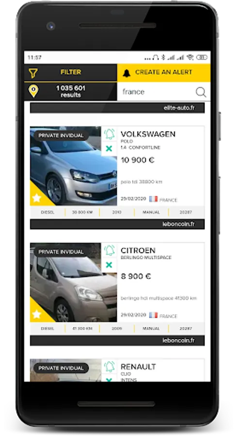Find all Ads of Cars for sale or purchase online from cities of France such as Paris, Lyon, Marseille, Nice, Bordeaux, Toulouse, Strasbourg, Nantes and others. This application contains the criteria for buying and selling used cars online. You can get the lowest cost on new and used cars by using this Application.