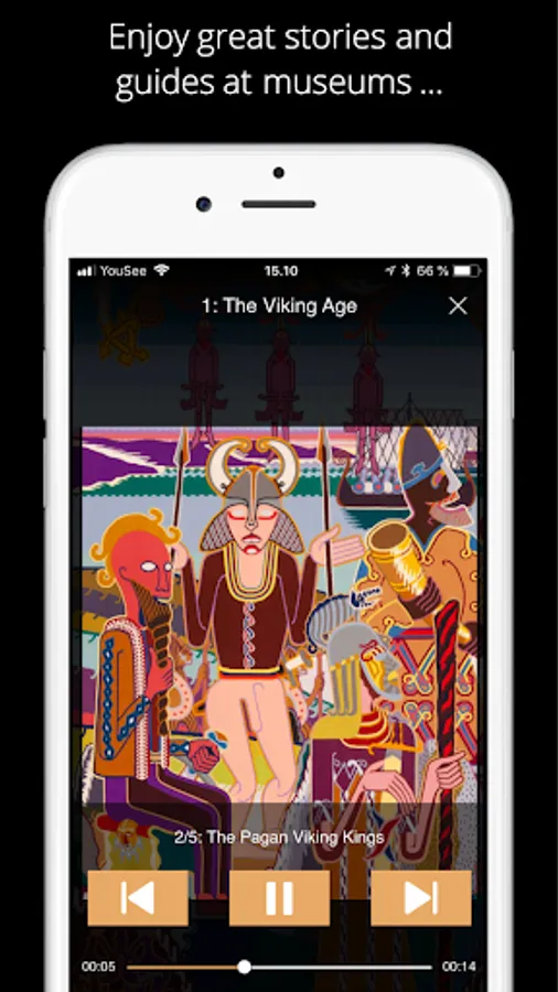 In the app you can experience entertaining and educational stories. Our audio guides are stories that will take you on a journey to the past or portray great personalities like Karen Blixen, H C Andersen and Søren Kierkegaard. Exiting narratives such as Kings in the Tapestries at Christiansborg Palace, The Rise and Fall of Roskilde in Roskilde, The seventies at the Museum of Oslo in Oslo, Danmarks sidste vikingekonge from Historiens Hus in Odense, Danskernes dagligdag i det 20. århundrede at Tidens Samling in Odense, Rundt om Magasin - Købmænd, mode og æggesalat from Magasin Museum in Copenhagen, Slavenes København in Copenhagen, Mysteriet om Elvira Madigan on Tåsinge, Eva’s War in Ramsgate.