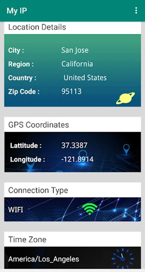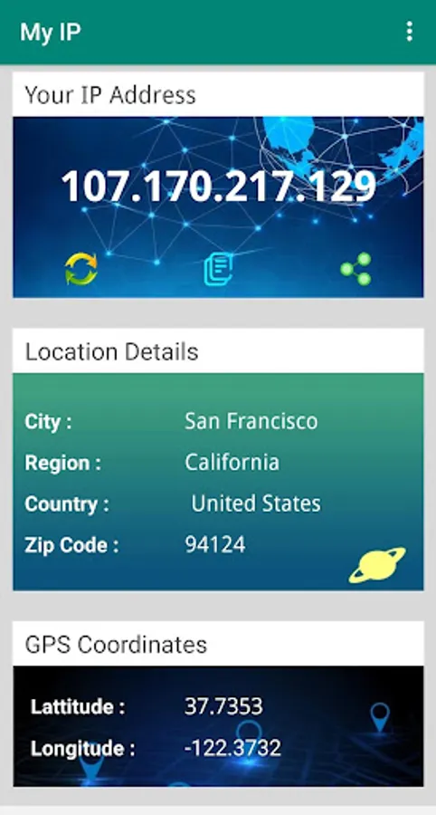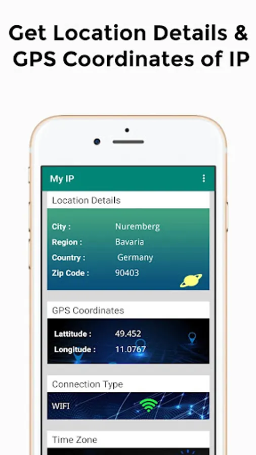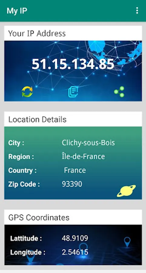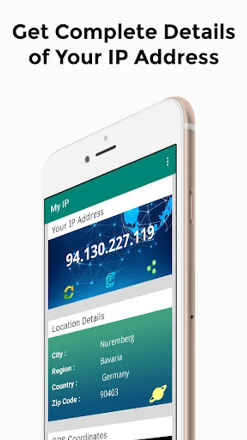 The app shows GPS Coordinates (Approximate Latitude and Longitude of your Current IP Address).