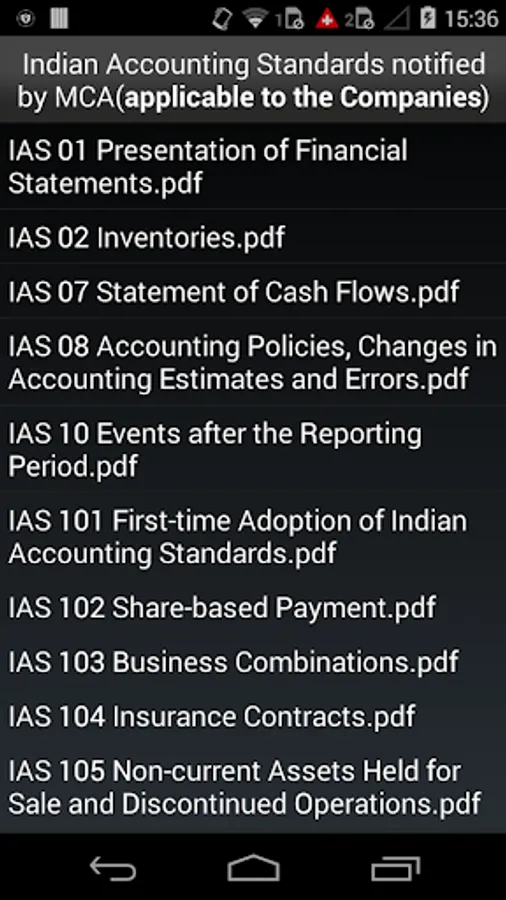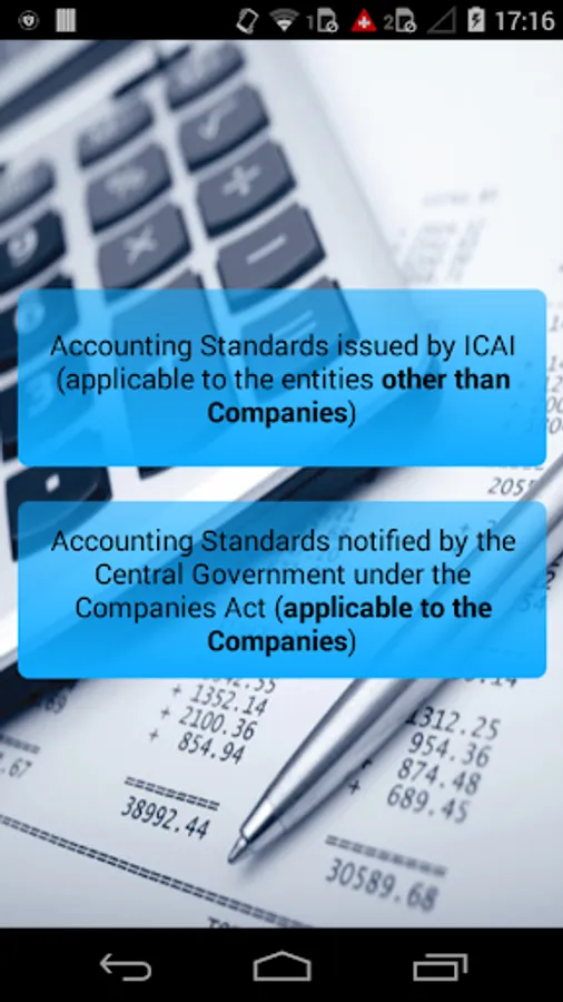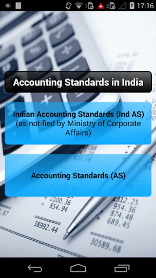 The app showcases Indian Accounting Standards (Ind AS) and Accounting Standards (AS) applicable in India.
