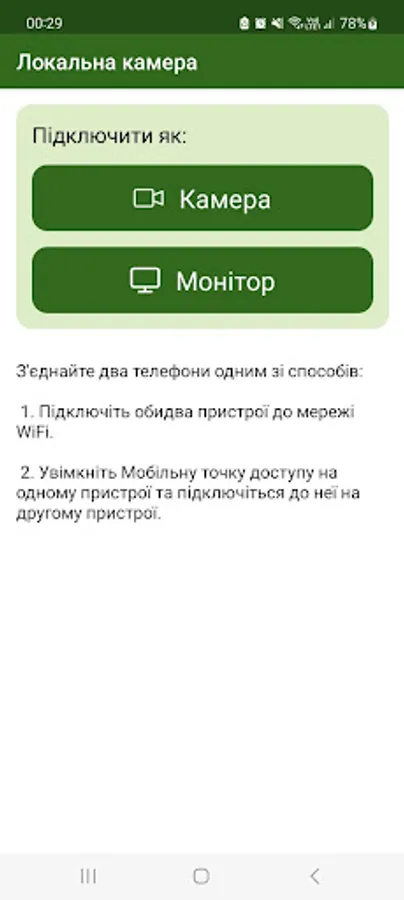 The application allows you to watch what the camera of another phone is recording on one phone. The phones can be connected to each other through the mobile hotspot of one of the phones, so no WiFi router is needed. The maximum tested communication distance between phones through a mobile access point is 180 steps. You can fix one phone on the observation point and see what it is shooting from a distance.