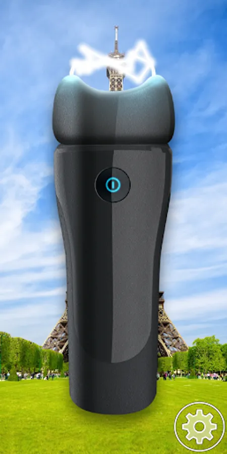 Install "Electric Stun Gun Simulator - iGun" and change your phone into electroshock weapon simulator. App displays image of a real taser gun and simulates lighting and electricity coming out of electrodes. Just press and hold your finger on electro shock weapon's picture and it will start working. An animation of high voltage electricity coming from the top probe will show up. You will notice pulsating vibration, hear electric shock sound and see LED light flashing like a stroboscope (the option of camera flash light available only on some devices). If you think that electricity effect is too weak open settings and adjust device voltage by yourself. Remember that you will gain the best visual effect using the app at night. To make simulator even more reliable it shows live camera view under fake weapon image. You will have an impression, as if you were holding a real electroshock device. You can turn off the virtual stun gun at any moment by taking off your finger from the picture of device.