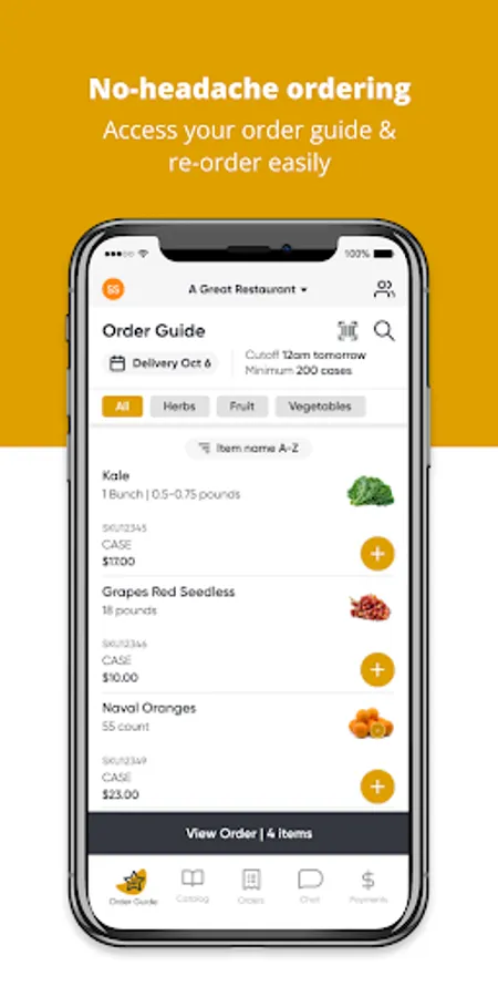 Our mobile app lets you search our complete product catalog, manage and update your ordering guide, and buy what you need at the moment you need it. It’s part of our commitment to giving you an ordering experience you’ll love.