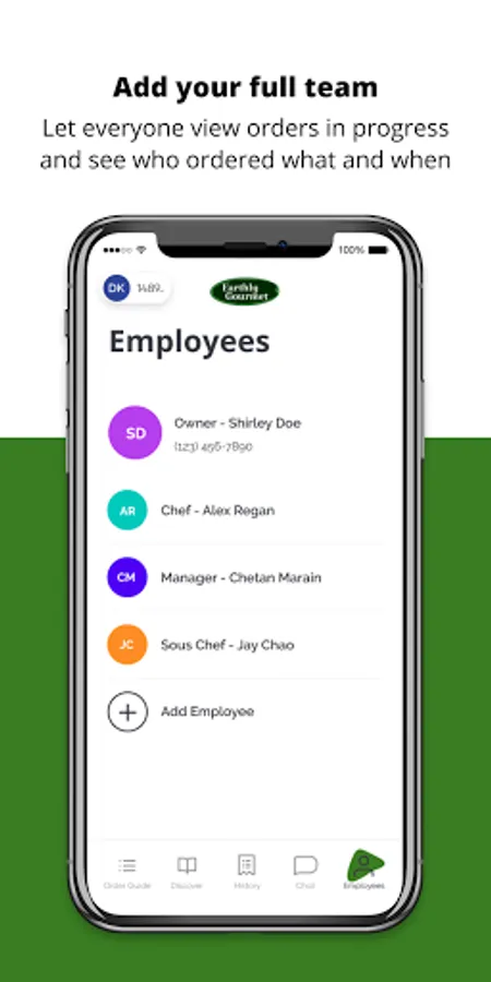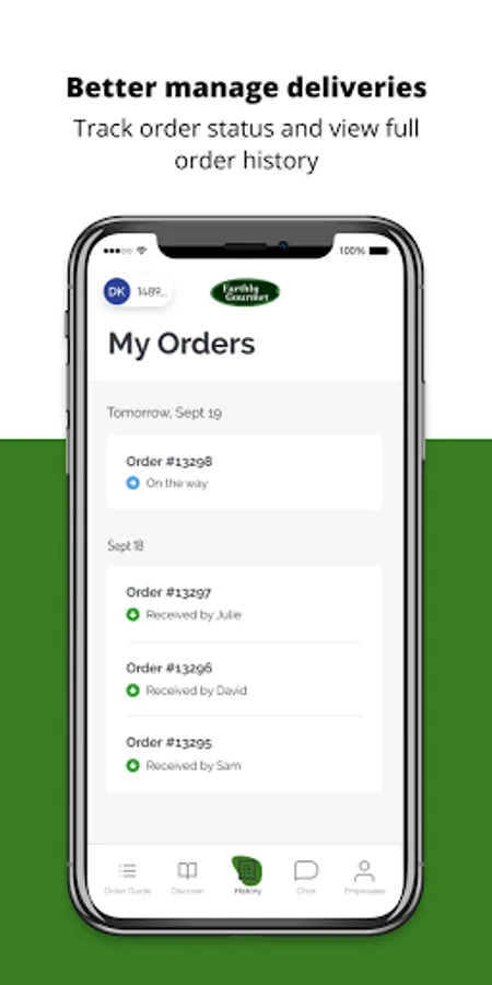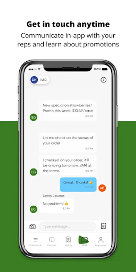 - Get in touch anytime: communicate directly with your Earthly Gourmet rep in the app